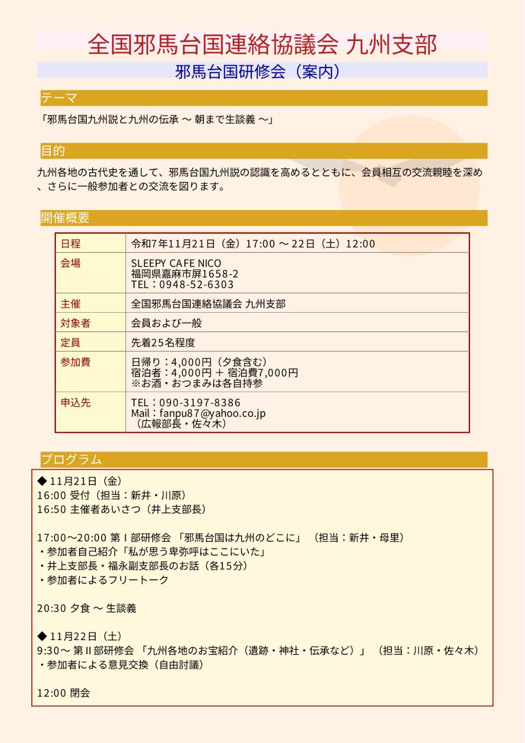 最新情報![]() ![]() 以下は、終わった事業です 邪馬台国サミット (北部九州の話題の三候補地がここに結集!) YouTubeやネットの世界で今話題の三氏が一堂に会して、各自説を発表。 佐々木のYouTube 福永のYouTube 井上のYouTube 日 時 令和7年4月26日(土)13:00~16:40 会 場 フレアス甘木 2F 学習室 参加費 1000円(予定) 主 催 全国邪馬台国連絡協議会九州支部 申し込み締め切り 令和7年4月22日までに電話もしくはFAXにて下記事務局へ お問い合わせ先 全国邪馬台国連絡協議会九州支部 事務局長 上野春樹 TEL 090-7393-7044 FAX 0946-22-2283 第1部 日田説! 佐々木祥治(支部副会長) 「大分に存在した、卑弥呼と台与の邪馬台国」 第2部 田川説! 福永晋三(支部副会長) 「邪馬台国と卑弥呼は田川説」 第3部 朝倉説! 井上悦文(支部会長・本部理事) 「邪馬台国卑弥呼は朝倉」 宿泊型の嘉麻市での勉強会の御案内 九州支部副会長福永晋三 九州支部事業部長 母里聖徳御参加下さい の講演と案内です。ぜひ ![]() ![]() 邪馬台国講演会、出版記念講演・YouTube動画紹介 九州支部会長 井上悦文 ![]() 以下、講演会動画